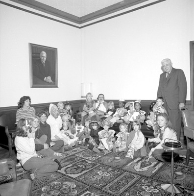 Jacksonville State University President Ernest Stone welcomes a group of nursery school children inside Bibb Graves Hall. The children visited the President's office dressed in Halloween costumes.
