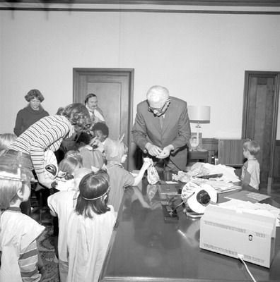 Jacksonville State University President Ernest Stone welcomes a group of nursery school children inside Bibb Graves Hall. The children visited the President's office dressed in Halloween costumes.