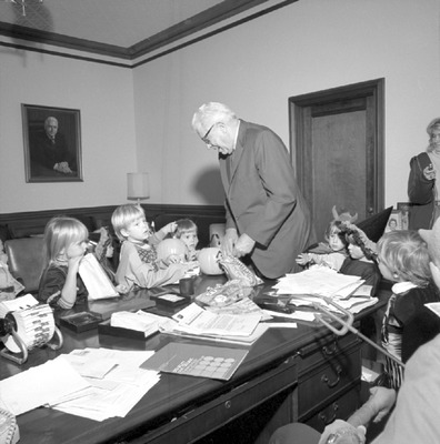 Jacksonville State University President Ernest Stone welcomes a group of nursery school children inside Bibb Graves Hall. The children visited the President's office dressed in Halloween costumes.