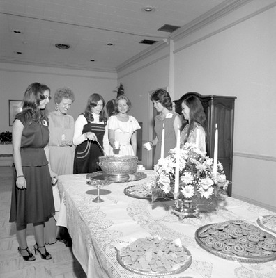 The United Nation's Day Tea is celebrated annually at the International House. Jacksonville State University International House students living in the House open their home to visitors and exchange students dress in native costumes. Shown students pour punch for guests at the refreshments table during the event held October 23, 1977.