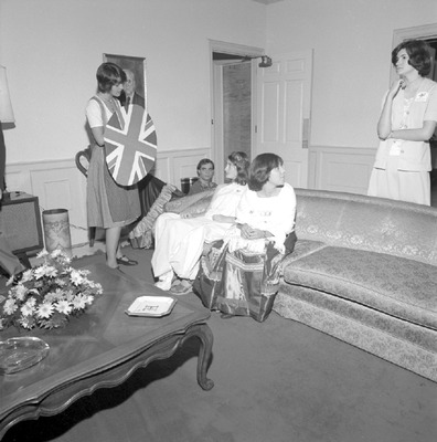 The United Nation's Day Tea is celebrated annually at the International House. Jacksonville State University International House students living in the House open their home to visitors and exchange students dress in native costumes. Shown students and/or guests gather inside during the event held October 23, 1977.