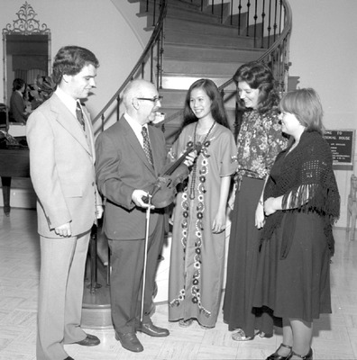 Foreign students at Jacksonville State University were entertained by music faculty member John Maltese during a monthly forum. Maltese showed his 1600s violin to students. Shown from left are John Knoke (Guatemala), John Maltese, Thao Nguyen (Vietnam), Julia Womack (Trussville, AL), and Monique Gooren (Holland). (circa February 22, 1978)