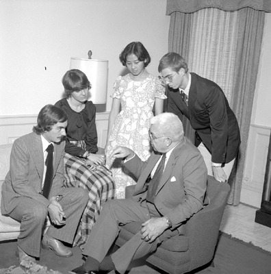Jean-Marc Desboudard (France), Dorothee Lobbermann (Germany), Gloria Feng (Taiwan), and Michael Ohman (Sweden) were students and International House program members at Jacksonville State University in 1977-1978. In 1977 they spent Christmas holidays as guests of the Rotary Club of Fort Myers, Florida. Shown they talk with a guest. (circa December 20, 1977)