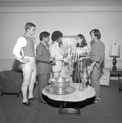 Students prepare for the International House annual United Nations Day tea and open house at Jacksonville State University. Shown from left are Michael Ohman (Sweden), Mohammad Hamid (Pakistan), William Parker (Birmingham, AL), Jasmin Eslait (Colombia), and Yasuyuki Otauka (Japan). (circa October 13, 1977)