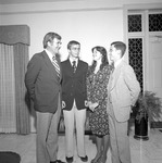 The Anniston Rotary Club provided a scholarship to a foreign student at Jacksonville State University in the International House Program. Shown from left are James Meigs (president of Anniston Rotary Club), Michael Ohman (scholarship recipient), and Dale Benson and Byron York look on. (circa January 18, 1978)