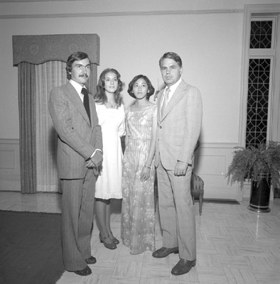 Federal Mogul Worldwide Distribution Center in Jacksonville provided a scholarship to a foreign student at Jacksonville State University in the International House Program. Shown from left are Jean-Marc Desboudard (scholarship recipient), Dianne Bell, Gloria Feng, Robert Denning (Federal Mogul's Jacksonville plant manager). (circa November 23, 1977)