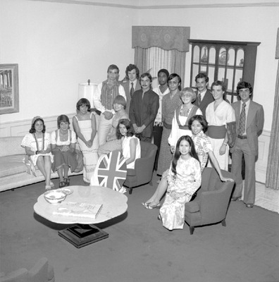 These students were members of the International House program at Jacksonville State University in 1977-1978. Shown are, seated, Sonia de Moraes (Brazil), Dorothee Lobbermann (Germany), Gianna Boido (Italy), Monique Gooren (Holland), Heather Maddever (England), Gloria Feng (Taiwan), Thao Nguyen (Vietnam), standing, Michael Ohman (Sweden), Pierre Delhaise (Belgium), Jean-Marc Desboudarad (France), Rene Morris (Panama), Yasuyuki Otsuka (Japan), Sinikka Makela (Finland), Javier Prado (Bolivia), John Knoke (Guatemala), Alberto Ruiz (Peru). (circa December 3, 1977)