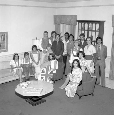 These students were members of the International House program at Jacksonville State University in 1977-1978. Shown are, seated, Sonia de Moraes (Brazil), Dorothee Lobbermann (Germany), Gianna Boido (Italy), Monique Gooren (Holland), Heather Maddever (England), Gloria Feng (Taiwan), Thao Nguyen (Vietnam), standing, Michael Ohman (Sweden), Pierre Delhaise (Belgium), Jean-Marc Desboudarad (France), Rene Morris (Panama), Yasuyuki Otsuka (Japan), Sinikka Makela (Finland), Javier Prado (Bolivia), John Knoke (Guatemala), Alberto Ruiz (Peru). (circa December 3, 1977)