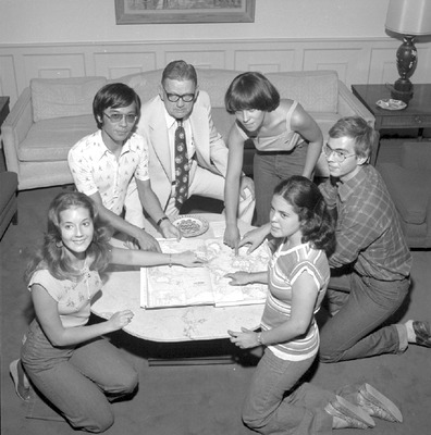 International House program students gather inside the International House with program director John Stewart at Jacksonville State University in 1977-1978. Together they look at a map. Students are Dianne Bell, Yasuyuki Otsuka, John Stewart, Gianna Bodo, Michael Ohman, Sonia de Moraes. (circa 1977)