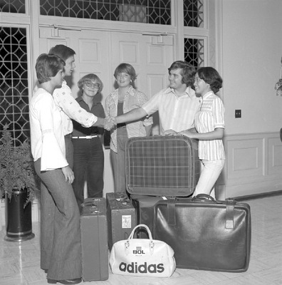 Jacksonville State University's International House welcomed newcomers in 1977. Shown are Dorothee Lobbermann (Germany), Ronald Walton (Birmingham, AL), Sinikka Makela (Finland), Susan Stephenson (Oxford, AL), Jimmy Smothers (Gadsden, AL), Gloria Feng (Taiwan). (circa September 8, 1977)