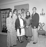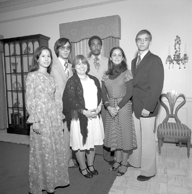 International House program students stand inside the International House at Jacksonville State University in 1977-1978. Identified students may be Thao Nguyen, Monique Gooren, Jasmin Eslait, Michael Ohman, Yasuyuki Otsuka, Rene Morris. (circa 1978)