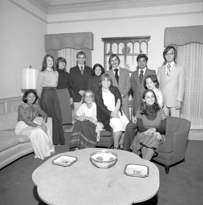 These students were members of the International House program at Jacksonville State University in 1977-1978. Shown are, seated, Gloria Feng, Sinekka Makela, Monique Gooren, Jasmin Eslait, Gianna Bodo, standing, Heather Maddeveir, Dorothee Lobbermann, Michael Ohman, Sonia de Moraes, Jean-Marc Desboudard, Mohammad Hamid, Yasuyuki Otsuka. (circa 1978)