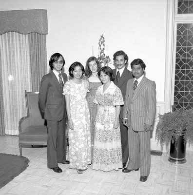 International House program students stand inside the International House at Jacksonville State University in 1977-1978. Shown may be Yasuyuki Otsuka, Gloria Feng, Heather Maddeveir, Gianna Boido, Javier Prado, Mohammad Hamid. (circa 1978)