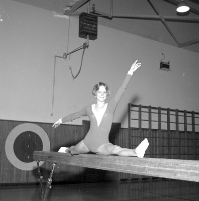 Cathy Cook was a member of the women's gymnastics team at Jacksonville State University in 1977-1978. Shown she uses the balance beam.