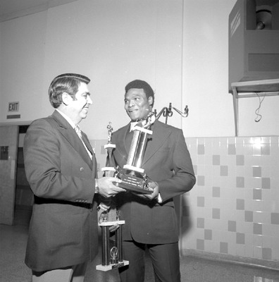 The outstanding athletes of the 1977 Gamecock football team were honored during the football awards banquet held January 20, 1978 in the Leone Cole Auditorium at Jacksonville State University. Athletic director Jerry Cole presents senior defensive tackle - middle guard Mike Baxter with two trophies; the team Spirit Award and the Unsung Hero Award.