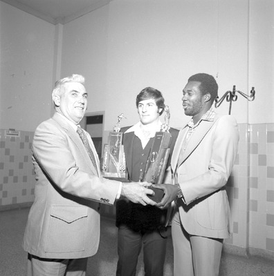 The outstanding athletes of the 1977 Gamecock football team were honored during the football awards banquet held January 20, 1978 in the Leone Cole Auditorium at Jacksonville State University. Shown the scholastic award trophy is presented to Butch Barker and the sportsmanship award trophy is presented to an unidentified player.