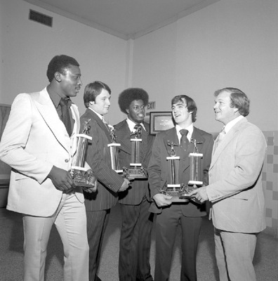 The outstanding athletes of the 1977 Gamecock football team were honored during the football awards banquet held January 20, 1978 in the Leone Cole Auditorium at Jacksonville State University. Head coach Jim Fuller congratulates Jesse Baker (Most Valuable Defensive Lineman), Randy Ragsdale (Most Valuable Offensive Lineman), Gurley Swanigan (Most Valuable Defensive Back), and Bobby Ray Green (Most Valuable Offensive Back and Most Valuable Player).