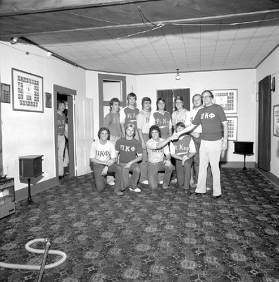 These students were members of Pi Kappa Phi at Jacksonville State University in 1977-1978. Identified is Clyde McSpadden (chapter advisor).