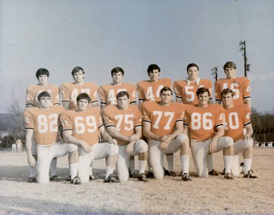 These 1970-1971 Jacksonville State University football players are shown outside in uniform. Identified from left may be, front row, Ralph Murphy, Sam Johnson, Ron Beaucham, George Porter, Gene Preskitt, Gary Godfrey, back row, Hassel Walls, Ricky Weems, Scotty Marcum, Wayne Hornbuckle, Charlie McRoberts, and unidentified (jersey 46). [courtesy of Mike Bynum]