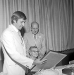 International House former students from years 1946-1964 met July 19-21, 1976 at Jacksonville State University for a reunion with program founder Dr. James H. Jones. Shown Dr. and Mrs. James H. Jones are presented with reunion gifts. (circa July 19, 1976)