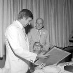 International House former students from years 1946-1964 met July 19-21, 1976 at Jacksonville State University for a reunion with program founder Dr. James H. Jones. Shown Dr. and Mrs. James H. Jones are presented with reunion gifts. (circa July 19, 1976)