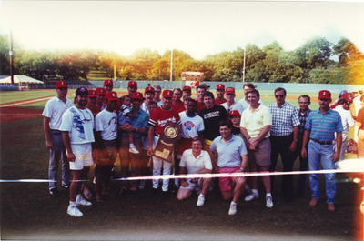 The Jacksonville State University Gamecock baseball team won the NCAA Division II National Championship in 1990. Shown baseball coach Rudy Abbott holds the plaque surrounded by others, possibly baseball alumni. (circa June 1990)
