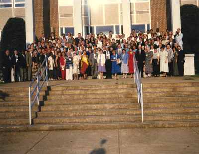 The Jacksonville State University International House Program Fiftieth Anniversary Reunion was held August 8-11, 1996. A group photo of reunion guests was taken on August 10, 1996 outside of a campus building.