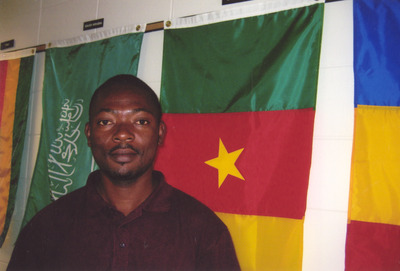 The English Language Institute prepared non-native English speakers for university study in the United States through immersive courses in the English language and American history and culture. Shown is a new student participant standing in front of the flag of Cameroon. (circa 2009)