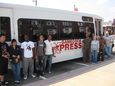 The English Language Institute prepared non-native English speakers for university study in the United States through immersive courses in the English language and American history and culture. Students stand beside the Gamecock Express.