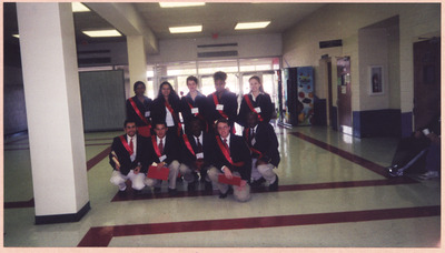 The International Student Organization (ISO) at Jacksonville State University (JSU) is a club for international and American students alike. It provides a platform for creativity and fosters cultural exchange through events and interactions. Shown are ISO members inside the Pete Mathews Coliseum hosting for the investiture ceremony of William A. Meehan held February 7, 2000.
