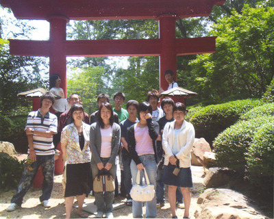 The English Language Institute prepared non-native English speakers for university study in the United States through immersive courses in the English language and American history and culture. Participants visited Birmingham Botanical Gardens in Birmingham, AL in 2006. Shown participants stand outside the Japanese garden. Identified is Ayako Makino.