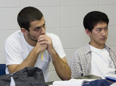 The English Language Institute prepared non-native English speakers for university study in the United States through immersive courses in the English language and American history and culture. Students from the English Language Institute pose around campus on November 1, 2005. Shown are students inside a classroom.