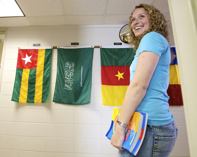 The English Language Institute prepared non-native English speakers for university study in the United States through immersive courses in the English language and American history and culture. An ELI student stands in the hallway of flags inside Salls Hall on April 17, 2008.