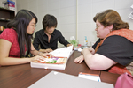 The English Language Institute prepared non-native English speakers for university study in the United States through immersive courses in the English language and American history and culture. ELI students meet with Dr. Linda Yost, ELI Instructor, inside an office on April 17, 2008.