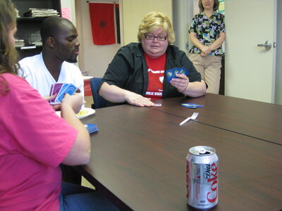 The English Language Institute prepared non-native English speakers for university study in the United States through immersive courses in the English language and American history and culture. Participants and guests gathered for an ELI Welcome Party inside Salls Hall in 2010. Shown they play a card game together. (circa May 12, 2010)