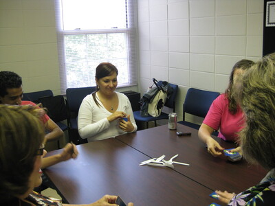 The English Language Institute prepared non-native English speakers for university study in the United States through immersive courses in the English language and American history and culture. Participants and guests gathered for an ELI Welcome Party inside Salls Hall in 2010. Shown they play a card game together. (circa May 12, 2010)