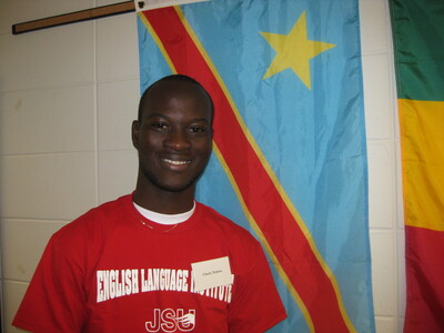 The English Language Institute prepared non-native English speakers for university study in the United States through immersive courses in the English language and American history and culture. Shown is Charly Ntahwa, new student participant, standing in front of the flag of the Democratic Republic of Congo on August 23, 2010.