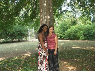 The English Language Institute prepared non-native English speakers for university study in the United States through immersive courses in the English language and American history and culture. Shown two participants stand gathered underneath a tree outside Salls Hall.