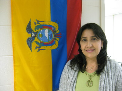 The English Language Institute prepared non-native English speakers for university study in the United States through immersive courses in the English language and American history and culture. Shown is a new student participant standing in front of the flag of Ecuador. (circa March 3, 2010)