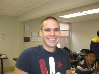The English Language Institute prepared non-native English speakers for university study in the United States through immersive courses in the English language and American history and culture. Students are shown inside a Salls Hall classroom. Identified students are Ran Bi (seated right) and Francisco Serrano (standing center). (circa Fall 2010)