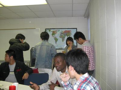The English Language Institute prepared non-native English speakers for university study in the United States through immersive courses in the English language and American history and culture. Participants and guests gathered for an ELI Christmas Party inside Salls Hall in 2010.