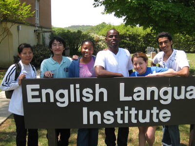 The English Language Institute prepared non-native English speakers for university study in the United States through immersive courses in the English language and American history and culture. Students pose outside the English Language Institute facility (located in Salls Hall) on April 22, 2010.