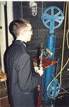 An oboe player stands waiting to enter on stage before a concert, possibly the March 21, 2000 JSU Chamber Winds in concert at Cleveland High School or Ringgold High School. (circa March 21-22, 2000)