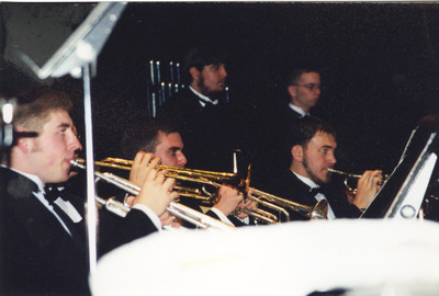 Jacksonville State University band members are shown during a concert, possibly the March 21, 2000 JSU Chamber Winds in concert at Cleveland High School or Ringgold High School. (circa March 21-22, 2000)