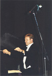 Dr. Kenneth G. Bodiford was the Director of Bands at Jacksonville State University in 1998-1999. Shown he conducts from the podium during a performance, possibly the March 21, 2000 JSU Chamber Winds in concert at Cleveland High School or Ringgold High School. (circa March 21-22, 2000)