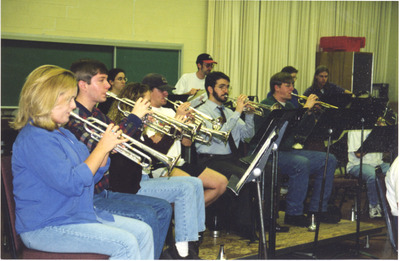Band members, possibly Chamber Winds, at Jacksonville State University are shown during a rehearsal in the band room with conductor Ken Bodiford (Director of Bands). (circa 1999-2000 or later)