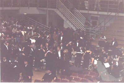 Dr. Kenneth G. Bodiford was the Director of Bands at Jacksonville State University from 1994-2025. Shown he greets others during a commencement ceremony held in Pete Mathews Coliseum. (circa 1999)