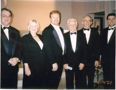 Dressed in formal wear are music faculty members Dr. Jerryl Davis, unidentified, Ken Bodiford, Dr. David L. Walters, Dr. Legare McIntosh, and Mark Brandon. (circa April 4, 2002)