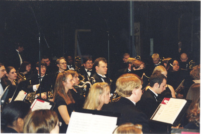 Band members at Jacksonville State University are shown during a Wind Ensemble performance, possibly during the April 17, 2000 Springing Concert in the Mason Hall Performance Center.