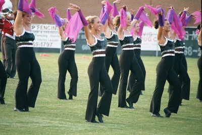 The Jacksonville State University Marching Southerners perform during a Fall 2000 performance, possibly a band exhibition performance at Tuscaloosa County High School in Northport, AL. The 2000 show title was "A Night in Birdland." Opener was "Birdland," the ballerina tune was "Night in Tunisia/Harlem Nocturne," and the closer was "Strawberry Soup." The band was under the direction of Kenneth G. Bodiford. Shown are ballerinas. (before October 2000)